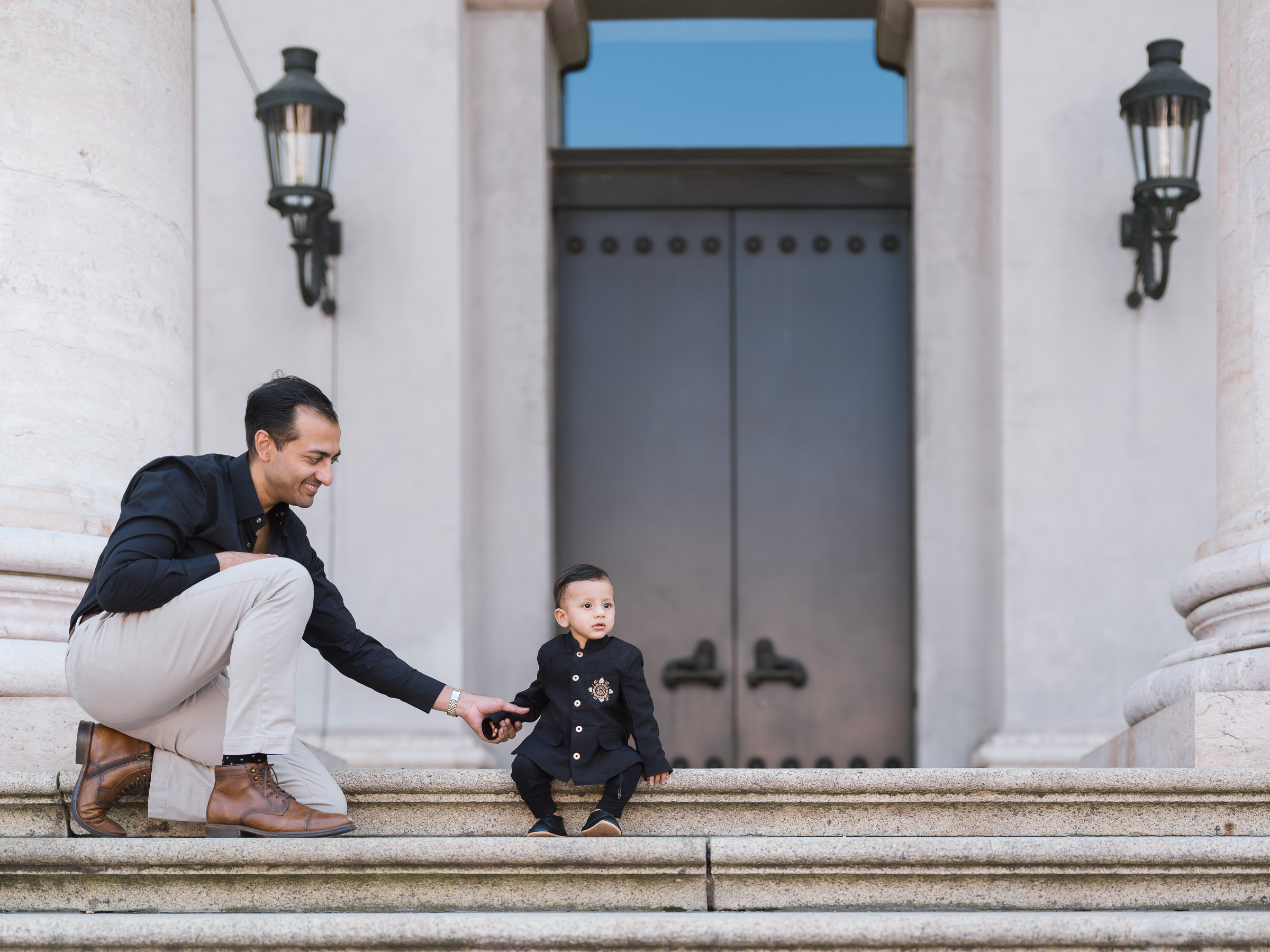 I love photographing families here because it offers so much creative freedom — elegant architecture, open space for movement, and always-changing light reflecting off the stone buildings.