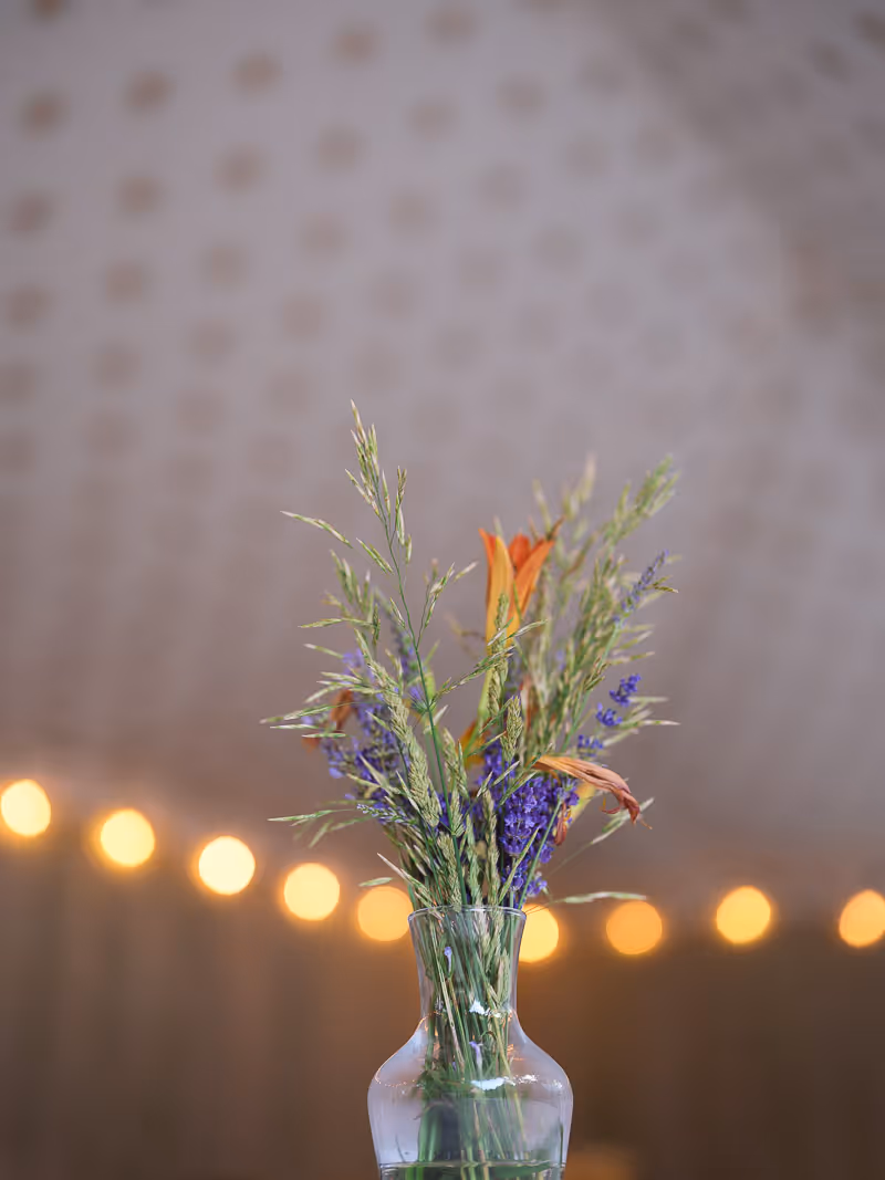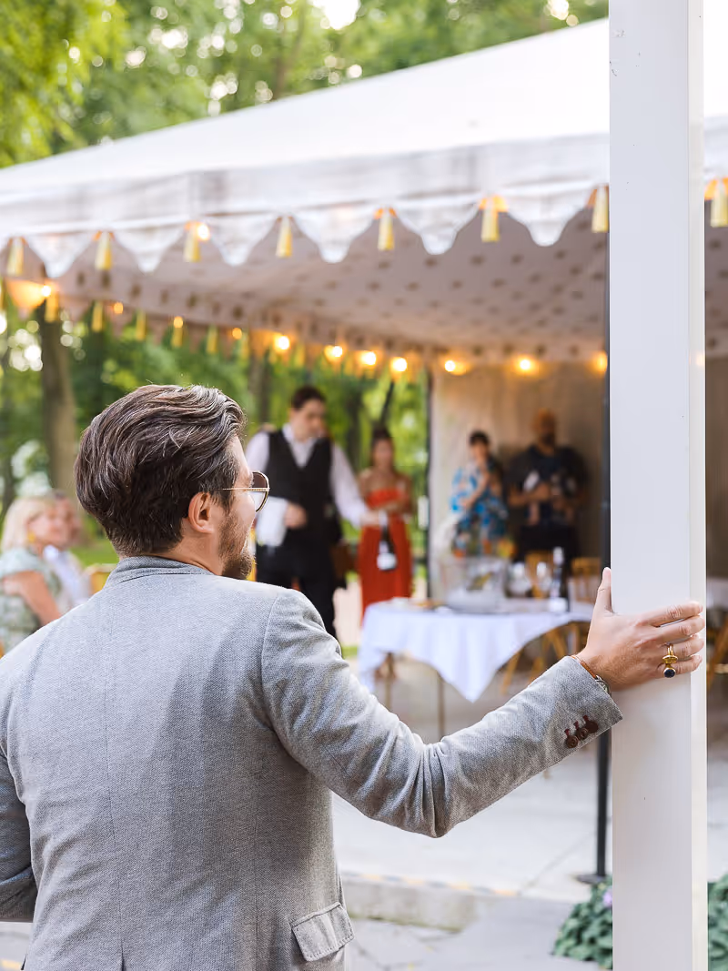 The Merrill tent isn’t your standard white event tent — look up, and you’ll see a ceiling painted with shimmering gold stars. It’s whimsical, romantic, and ideal for candlelit dinners or dancing under the glow of string lights.