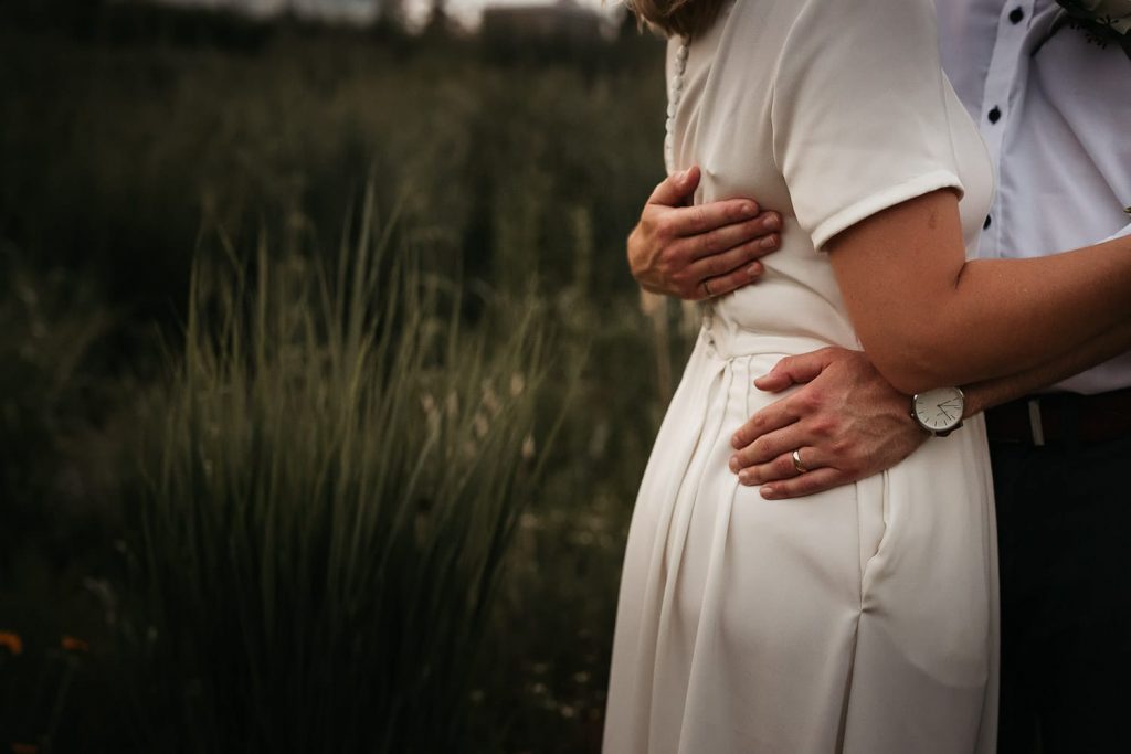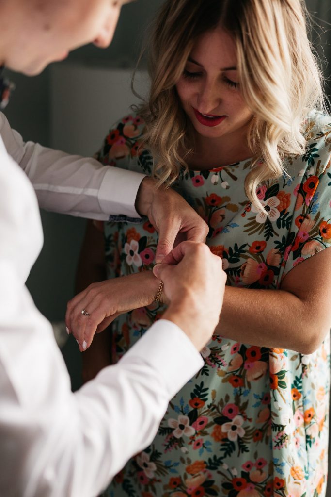 Queen’s Landing Hotel is stunning. Full stop. The suite Adam and Elizabeth chose had plenty of space, a bedroom, a sitting room and two bathrooms. It worked perfectly for a chilled morning, getting ready and popping champagne. Adam and Elizabeth chose to get ready together, with no bridal party. Both Elizabeth and Adam had such intentional outfits and details. Elizabeth made her own dresses, a floral one for dinner, and a white dress for the wedding ceremony. She paired both with clogs from Bryr Clogs. Adam paired a floral bowtie with a white dress shirt and grey pants. Elizabeth surprised Adam with a new handmade leather belt from Solid Leather as a wedding gift. Elizabeth’s parents popped in for a quick hello and dropped off the most thoughtful gift of vintage wine (from Elizabeth’s birth year) and then it was time to pop some bubbly and head out for a mini couple’s portrait session on the grounds of Queen’s Landing Hotel.