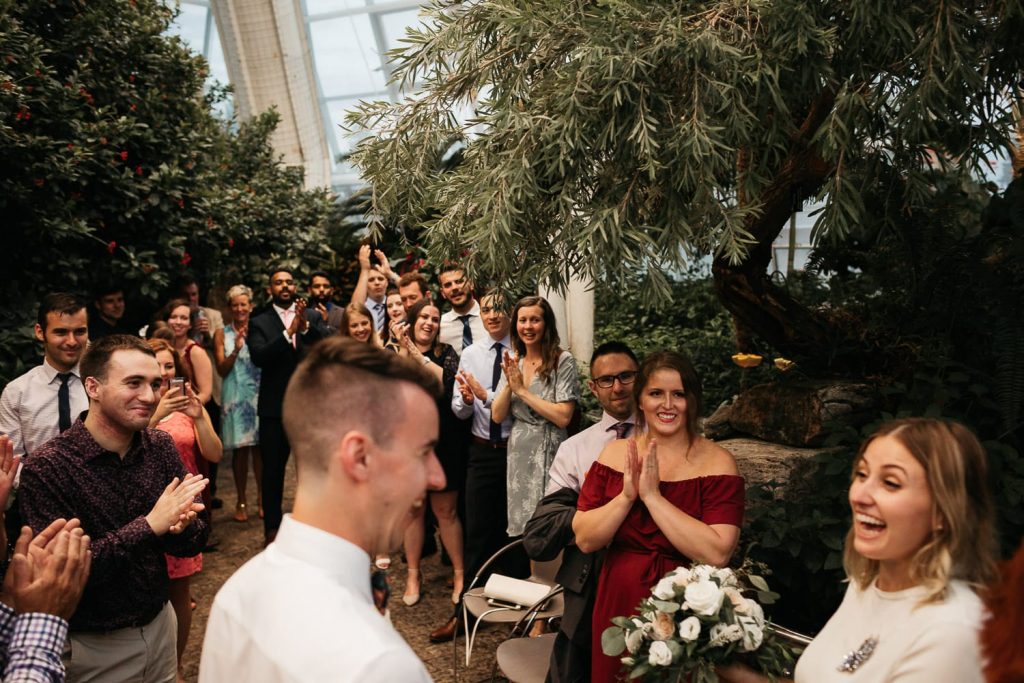 After dinner, Adam and Elizabeth brought their guests to the Niagara Botanical Gardens, Butterfly Conservatory for an evening wedding ceremony. The Butterfly Conservatory was reserved for only their party and everyone was able to wander the space, observing the butterflies and their habitat for 30 minutes before the ceremony.